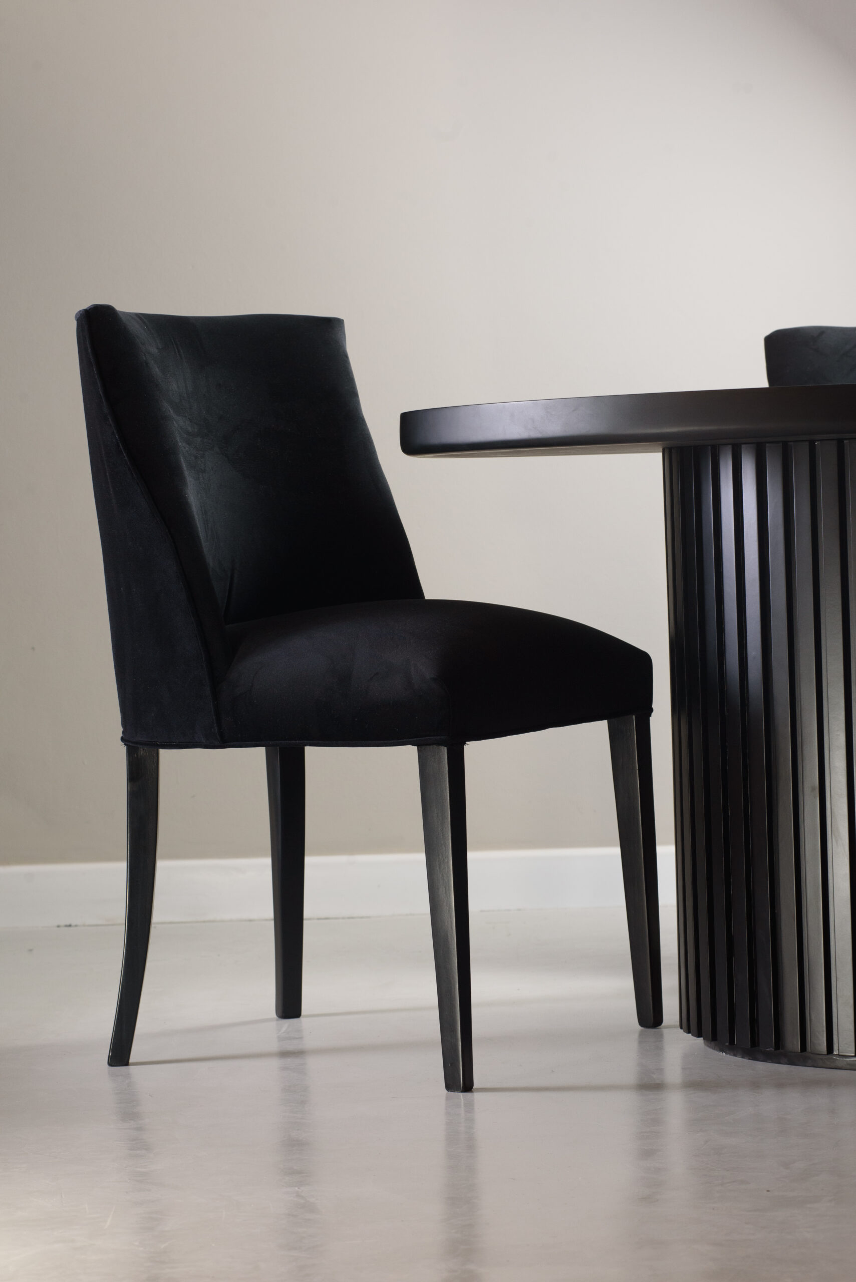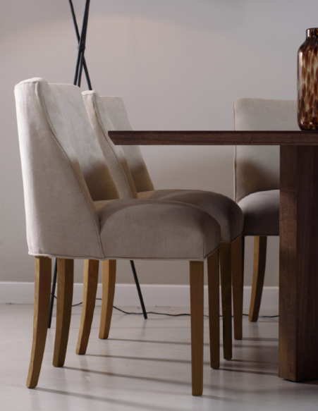 Su estilo versátil permite combinarla con mesas modernas o clásicas, eligiendo el tono de las patas y el género que mejor acompañe el espacio.